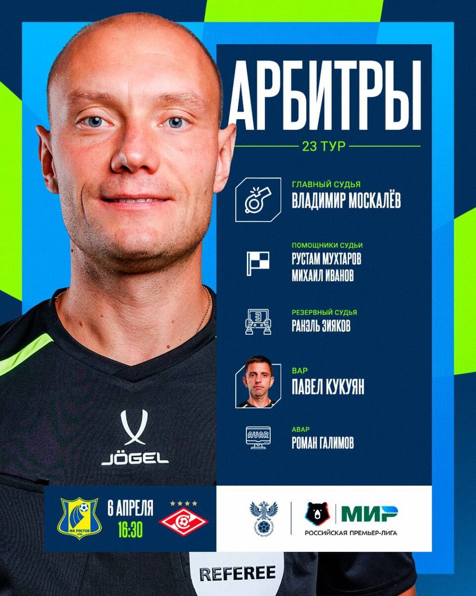 Владимир Москалёв обслужит матч Ростов — Спартак-Москва. Кукуян — VAR.