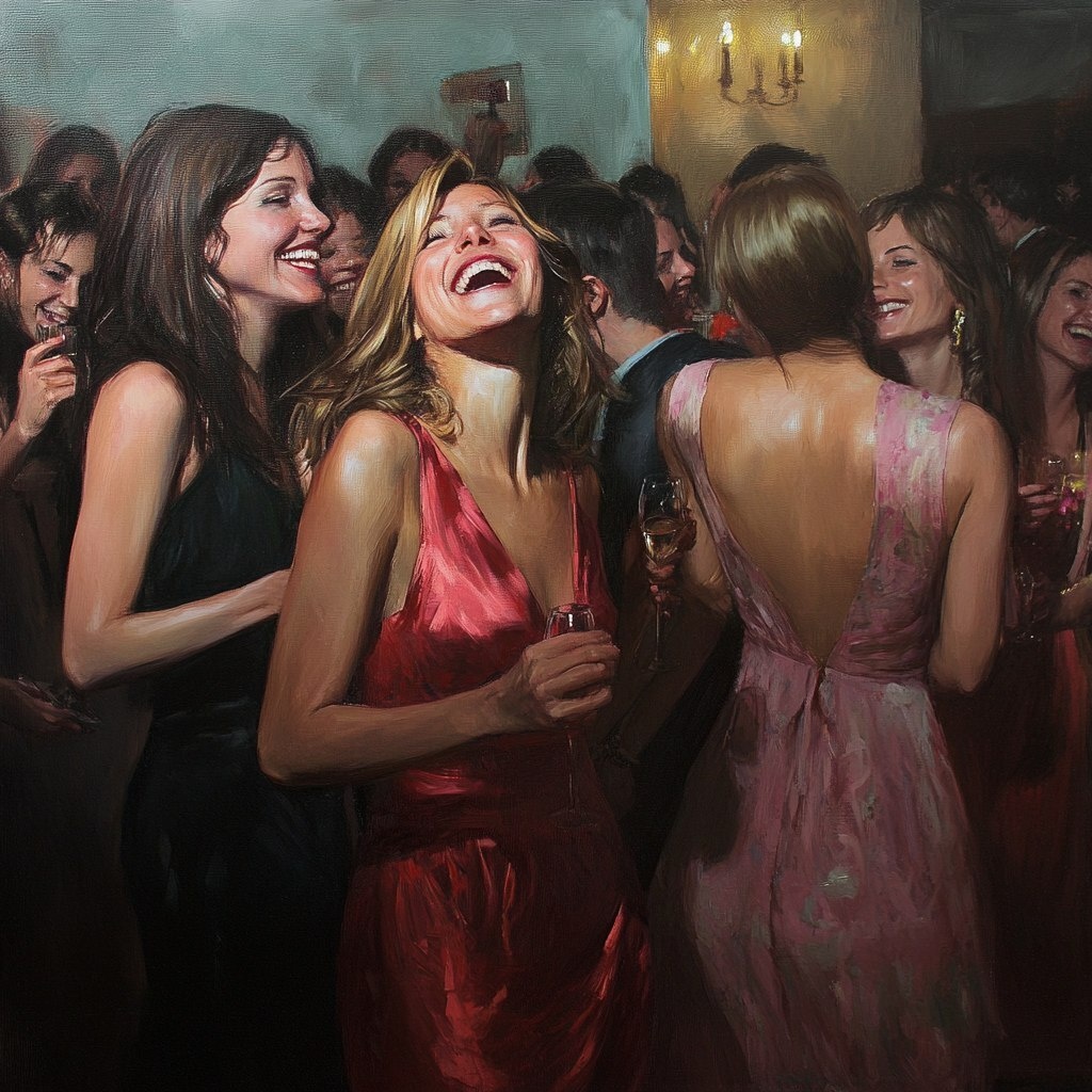Создано на основе запроса: The smiling faces of women and the joyful scenes of parties, in a realistic style