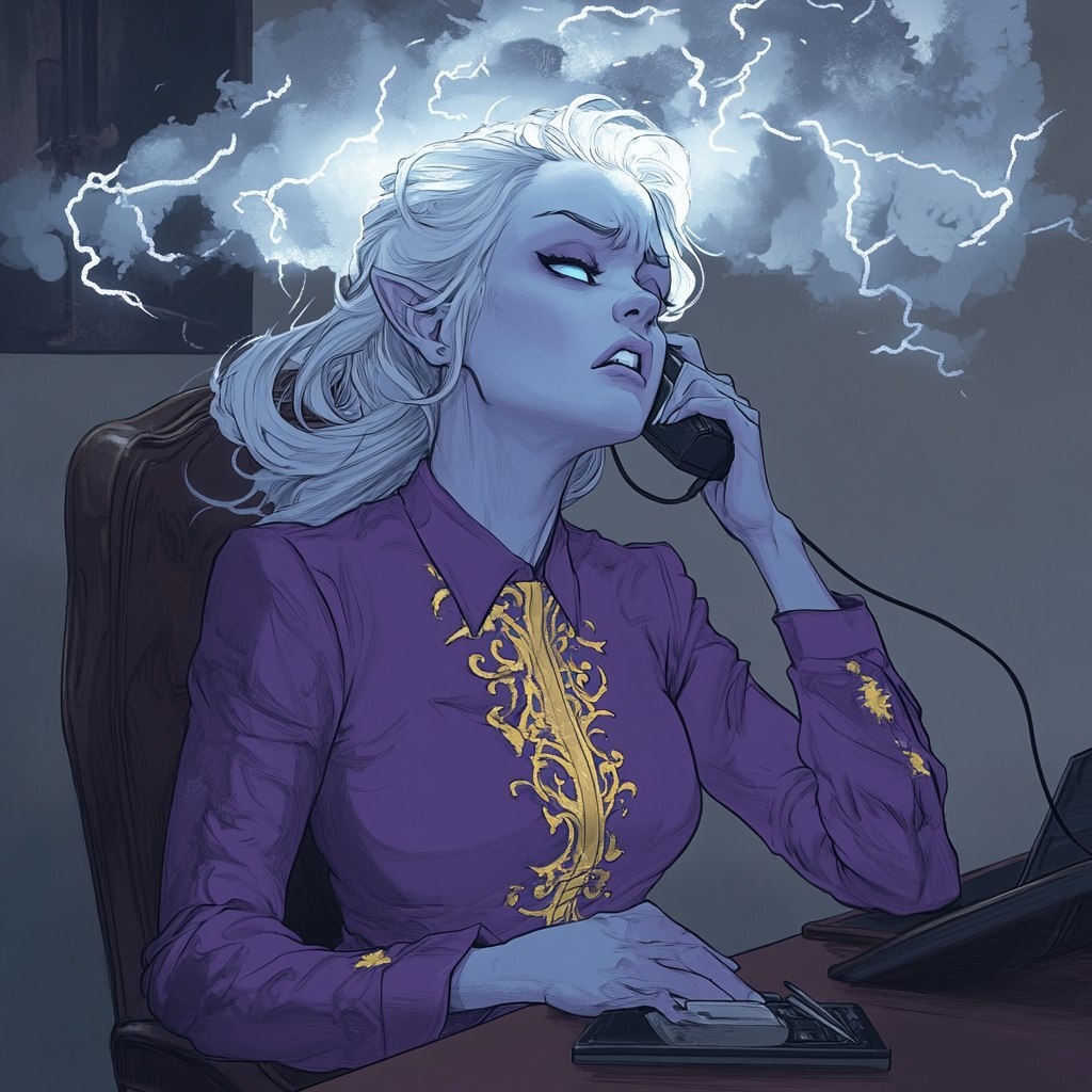 Создано на основе запроса: dungeons and dragons style artwork of a stressed, annoyed-looking secretary with pale blue skin at a desk on a phone wearing a work-appropriate purple dress with some yellow embroidery. Her her is a stormy, dark grey cloud that rises above her --- Автоперевод: Подземель и драконы стиль искусства стрессового, раздраженного секретаря с бледно-голубой кожей за столом на телефоне с подходящим для работы фиолетового платья с желтой вышивкой. Какое твое впечатление? 🤔 https://dzen.ru/id/65c0c65c86e4f837c27b24d7 #ИИ #AI #нейросеть #midjourney #art