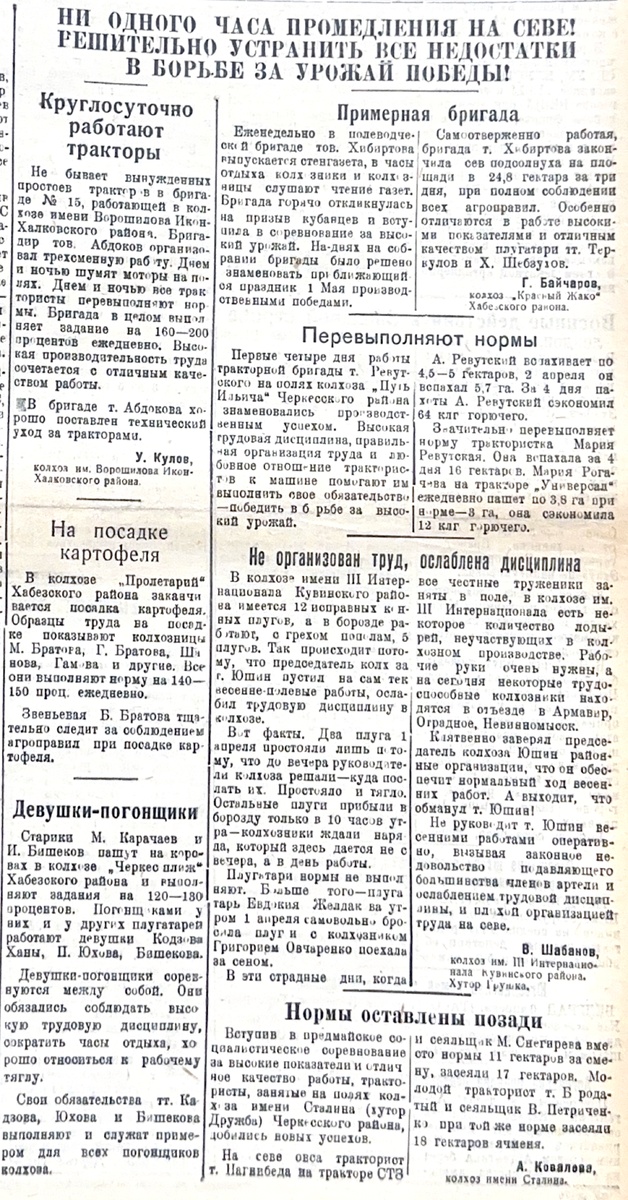 Вступив в предмайское социалистическое соревнование за высокие показатели и отличное качество работы, трактористы, занятые на долях колхоза имени Сталина (хутор Дружба) Черкесского района, добились новых успехов. На севе овса тракторист т. Нагнибеда на тракторе СТЗ и сеяльщик М. Снегирева вместо нормы 11 гектаров за смену, засеяли 17 гектаров. Молодой тракторист т. Бородатый и сеяльщик В. Петриченко при той же норме засеяли 18 гектаров ячменя.
