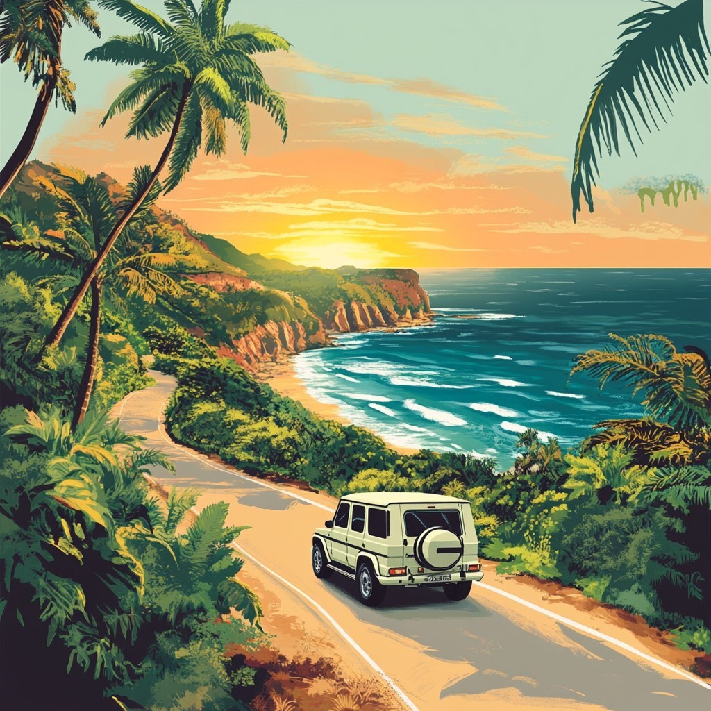 Создано на основе запроса: An illustration of A vintage, retro-style cover, A G63 driving along the coastal road of La Jaguara, filled with