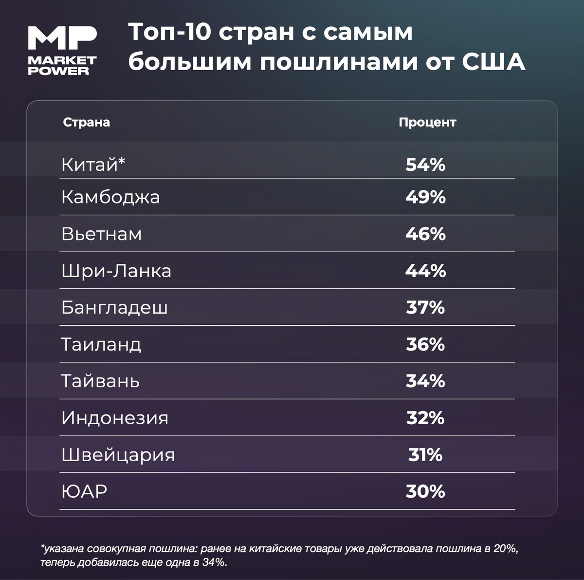 - С 9 апреля для ряда стран с крупными торговыми дефицитами введены более высокие тарифы (см. картинку).