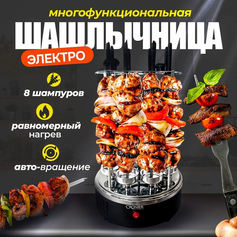 Шашлык — это не просто еда, это целая культура, обычаи и традиции, которые объединяют людей за столом. Приготовление шашлыка на открытом огне — это искусство, но что делать, если вы хотите наслаждаться этим деликатесом в любое время года, не выходя из дома? Ответ прост — электрошашлычница CRONIER. Эта вертикальная шашлычница с мощностью 1500 Вт и возможностью использования 8 шампуров обещает стать вашим верным помощником в кулинарных приключениях. Давайте подробно рассмотрим, что же делает эту шашлычницу такой привлекательной.