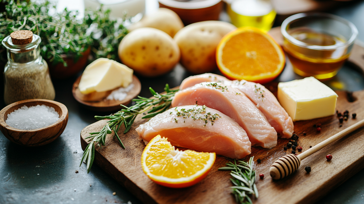 - В небольшой сковородке нагрей сок одного апельсина, добавь мёд, горчицу и цедру.