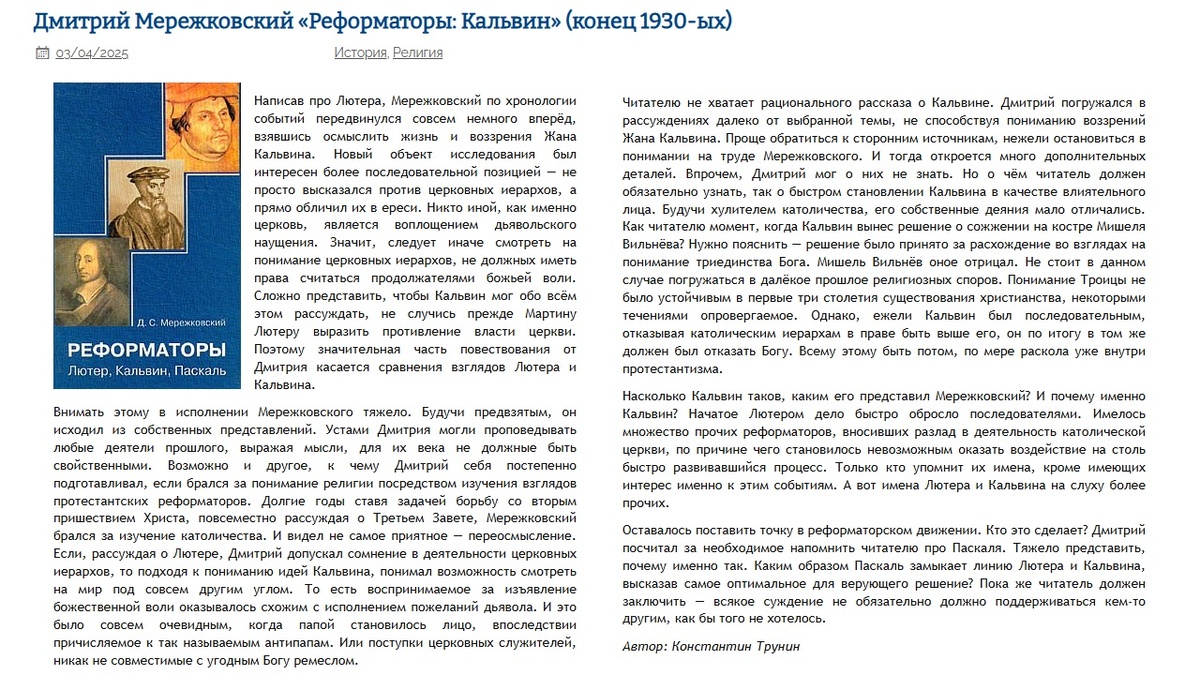 Дмитрий Мережковский "Реформаторы: Кальвин" (конец 1930-ых) | Критика