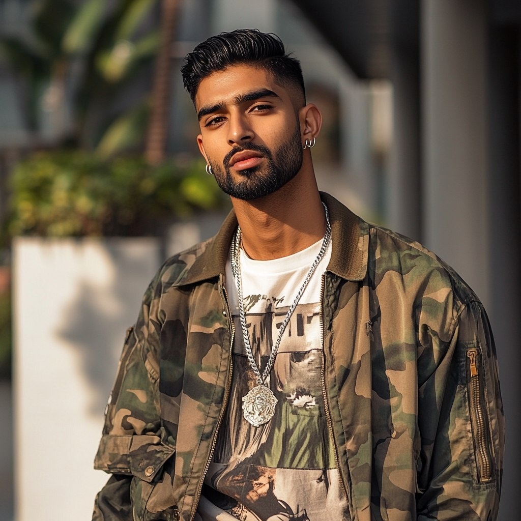 Создано на основе запроса: A 22-year-old Indian man with sharp features, neatly styled undercut hair, and a well-groomed beard. He has a clear, smooth complexion and deep brown eyes. He is wearing an oversized graphic T-shirt layered with a lightweight bomber jacket, paired with well-fitted cargo pants and trendy sneakers. He accessorizes with a silver chain, multiple rings, and stylish sunglasses resting on his forehead. His confident smirk and relaxed pose make him exude effortless Gen Z coolness. --- Автоперевод: 22-летний индийский мужчина с острыми чертами, аккуратно стилизованными подкожими волосами и ухоженной бородой. Как тебе эта генерация? 🤔 https://dzen.ru/id/65c0c65c86e4f837c27b24d7 #ИИ #AI #нейросеть #midjourney #art