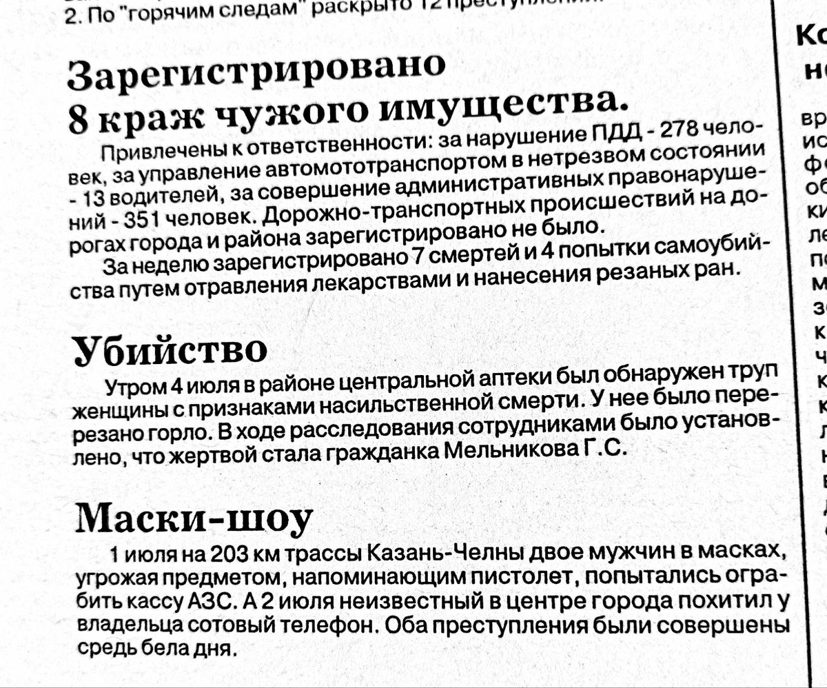 Существует мнение, что самые мрачные бандитские времена приходились на 90-е годы, а в нулевых весь криминал разом рассосался. Было плохо-плохо, а все разом наладилось. Разумеется это далеко не так. Наиболее громкие заказные убийства в Елабуге произошли уже в эпоху правления Гафурова, и криминальная хроника в газетах того времени занимала значительную печатную площадь. Вот одна из недельных статистик 2003 года. За неделю 7 смертей и 4 попытки суицида. Из этих 7 смертей - четыре удавления. И это не считая разбоев, грабежей и воровства, квартир, которые в нынешние времена почти исчезли как вид преступления.