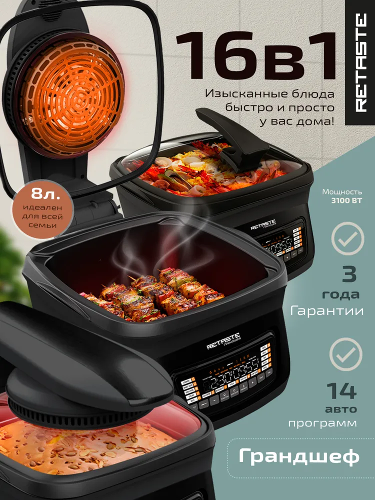 - Многофункциональность: ГрандШеф 16 в 1 позволяет готовить разнообразные блюда, что делает его отличным выбором для тех, кто любит экспериментировать на кухне.