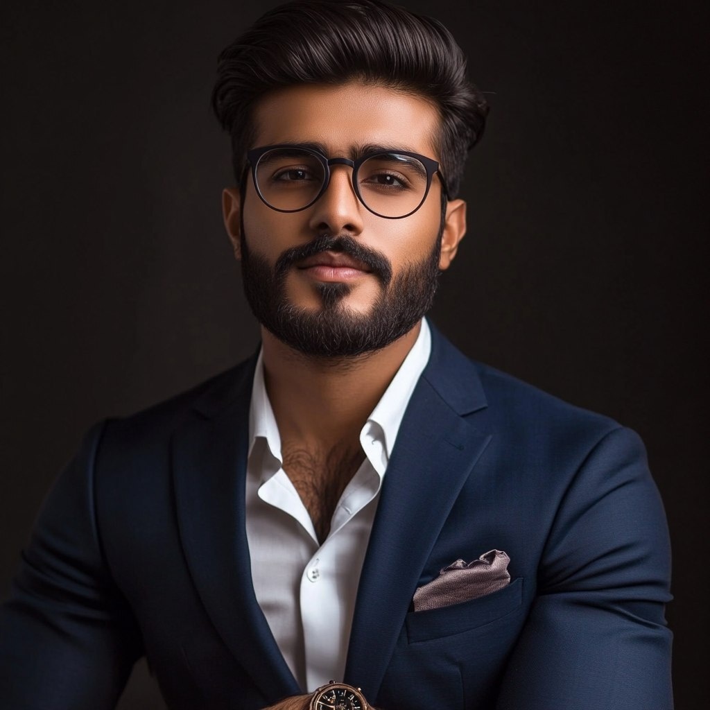 Создано на основе запроса: A handsome 28-year-old Indian man with neatly styled hair, a well-groomed beard, and sharp facial features. He has flawless, even-toned skin with a healthy glow. He is wearing a fitted navy blue suit with a crisp white shirt, exuding class and elegance. His accessories include a luxury wristwatch and stylish rectangular glasses. His posture is confident, with a slight smile, making him look sophisticated and influential.