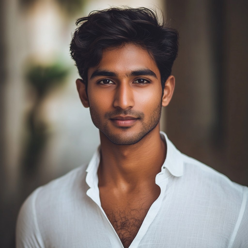 Создано на основе запроса: A 25-year-old South Indian man with a strong jawline, expressive dark brown eyes, and neatly styled, slightly wavy black hair. His warm, medium-brown skin has a natural glow, highlighting his well-groomed appearance. He is dressed in a crisp, well-fitted white linen shirt with the sleeves casually rolled up, paired with tailored dark grey trousers. A minimalist black wristwatch rests on his wrist, adding a touch of sophistication. His expression is calm and confident, with a slight, thoughtful smile as he looks directly into the camera. The softly blurred background enhances his modern yet effortlessly classic charm, with natural lighting emphasizing his polished yet relaxed presence.
