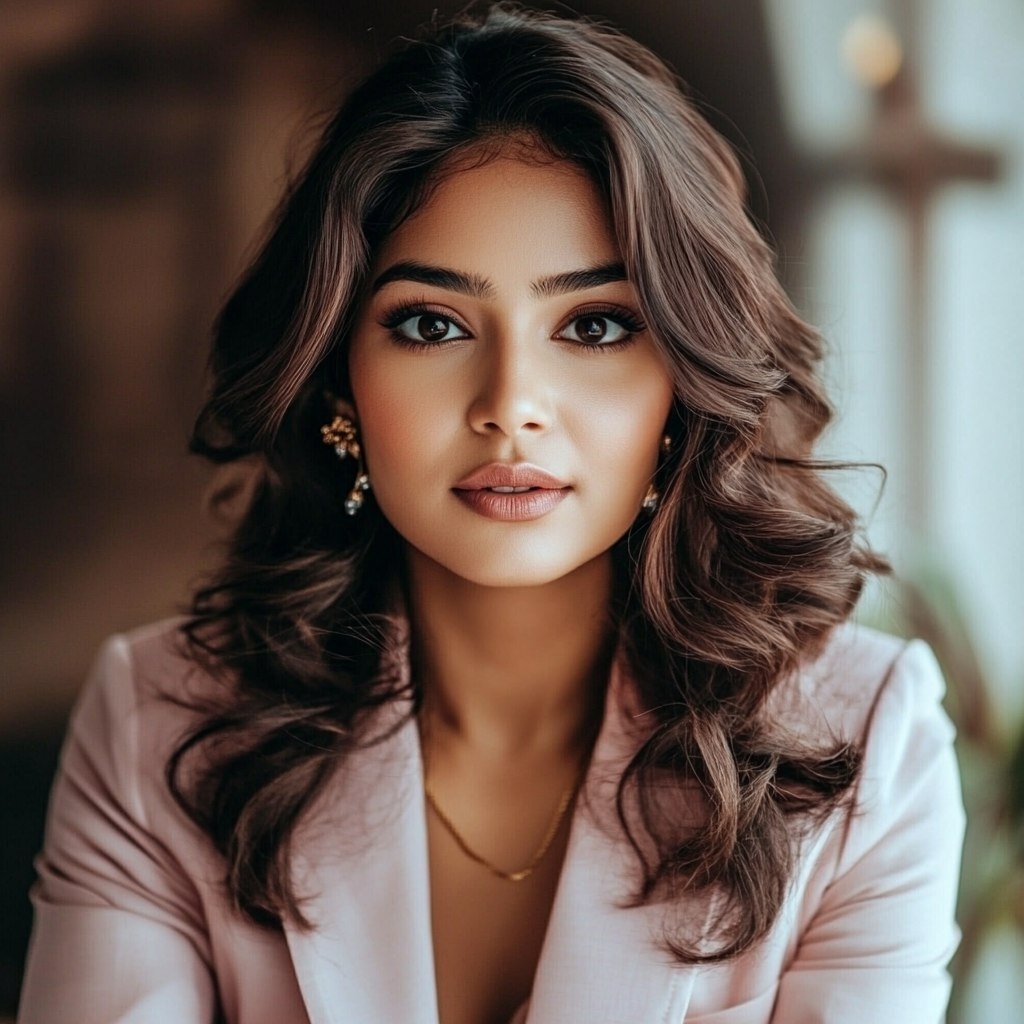 Создано на основе запроса: A stunning 25-year-old Indian woman with medium-length wavy hair, deep brown eyes, and a confident expression