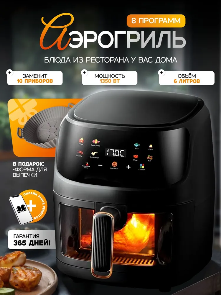 Объем в 6 литров — это оптимальный размер для семейных ужинов, когда нужно накормить нескольких человек. Вы сможете легко готовить как небольшие порции, так и полноценные блюда, такие как запеченная курица или картофель фри.