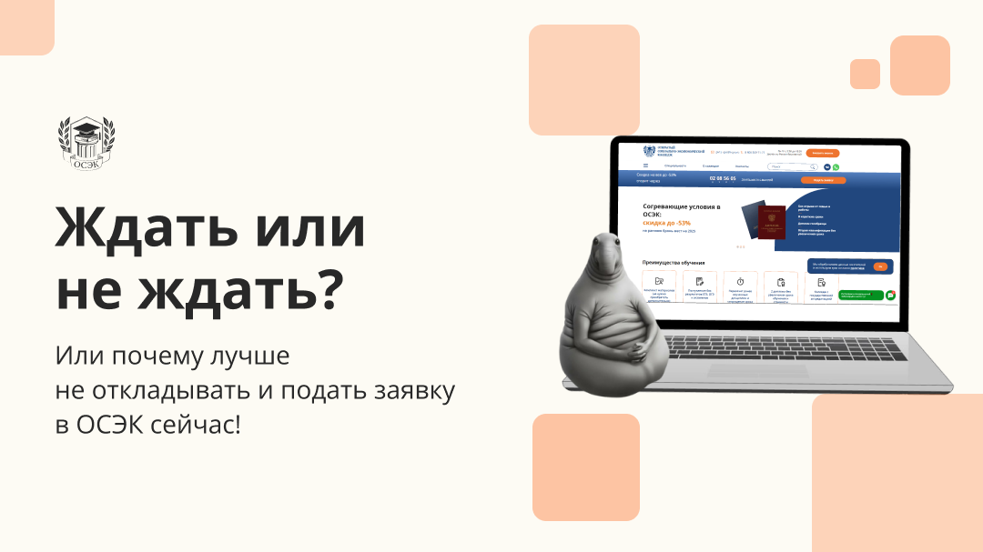 Кажется, поступать лучше летом — так привычнее. Но зачем ждать, если можно действовать уже сейчас и получить максимум выгоды? ✅ Почему лучше не откладывать и подать заявку в ОСЭК сейчас? ✔ Скидка до -53% на обучение — зафиксируйте выгодную цену на весь срок. ✔ Гарантированное место в списке зачисления – не рискуйте, чтобы не остаться «за бортом». ✔ Ранний доступ к учебным материалам — познакомьтесь с программой заранее и начните подготовку. 💰 Цены на обучение могут вырасти. Но у вас есть возможность зафиксировать стоимость уже сейчас! 📚 А еще в ОСЭК вас ждет: ✔ Полностью дистанционное обучение — учитесь из любого города. ✔ Поступление без конкурсов, ОГЭ и ЕГЭ — просто подайте заявку. ✔ Бесплатная профпереподготовка – расширьте свои профессиональные возможности. ✔ Поддержка преподавателей и кураторов — вы не останетесь один на один с учебой. Не ждите и позаботьтесь о поступлении уже этой весной!