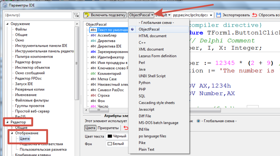 Редактор автоматически определит (по расширению файла), какую цветовую схему использовать. А чтобы настроить подсветку под ваши требования, надо выбрать нужный язык, а затем выбрать цвета для каждого элемента языка.