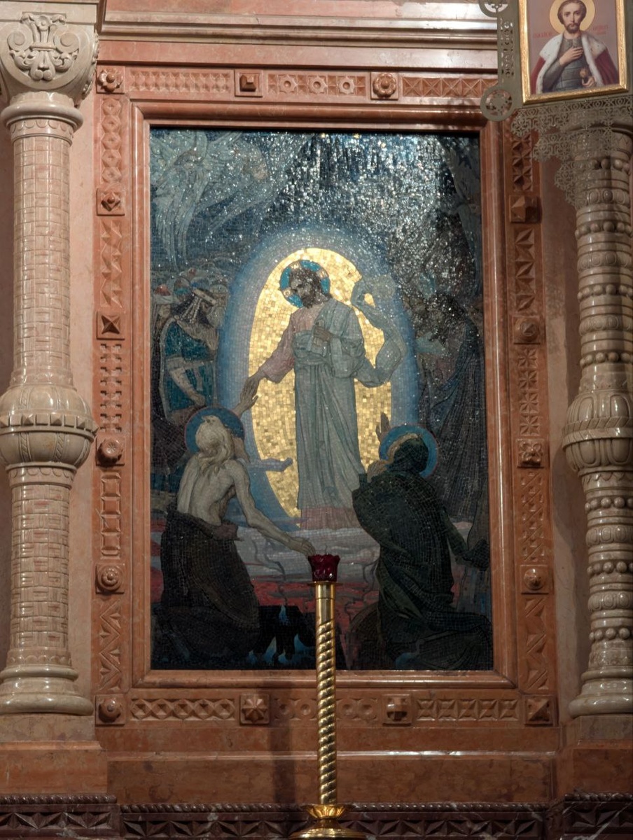 СПб 2025. Сошествие во ад. Спас на крови носит имя Собор Воскресения Христова. Экскурсовод задала вопрос: "Чем занимался Иисус, до того как поняли, что он воскрес", все пожали плечами. Из истории: пришли к гробнице, она открыта, там пусто. Оказалось (со слов экскурсовода), что он в это время спускался в ад. Так как с тех времён, когда Адама и Еву изгнали из рая, за то что они сорвали "запретный плод", их изгнали не на землю, а в ад, и врата рая закрылись для всех. Все, кто умирал, попадали в ад, не смотря на свою правидность. Так вот, согласно преданию, после распятия Христос спустился в ад, разбил адские двери и вывел из бездны Адама, Еву и праведников. На иконе «Сошествие во ад» изображено это событие. Адам и Ева должны были исповедаться и тем самым открыть врата в рай. Соответственно, это и было Воскрешение. Честно говоря, для меня это было совсем новым материалом! Да, кстати, кому будет интересно, у Адама была ещё и первая жена, Лилит. Сотворенная равной мужчине. Но