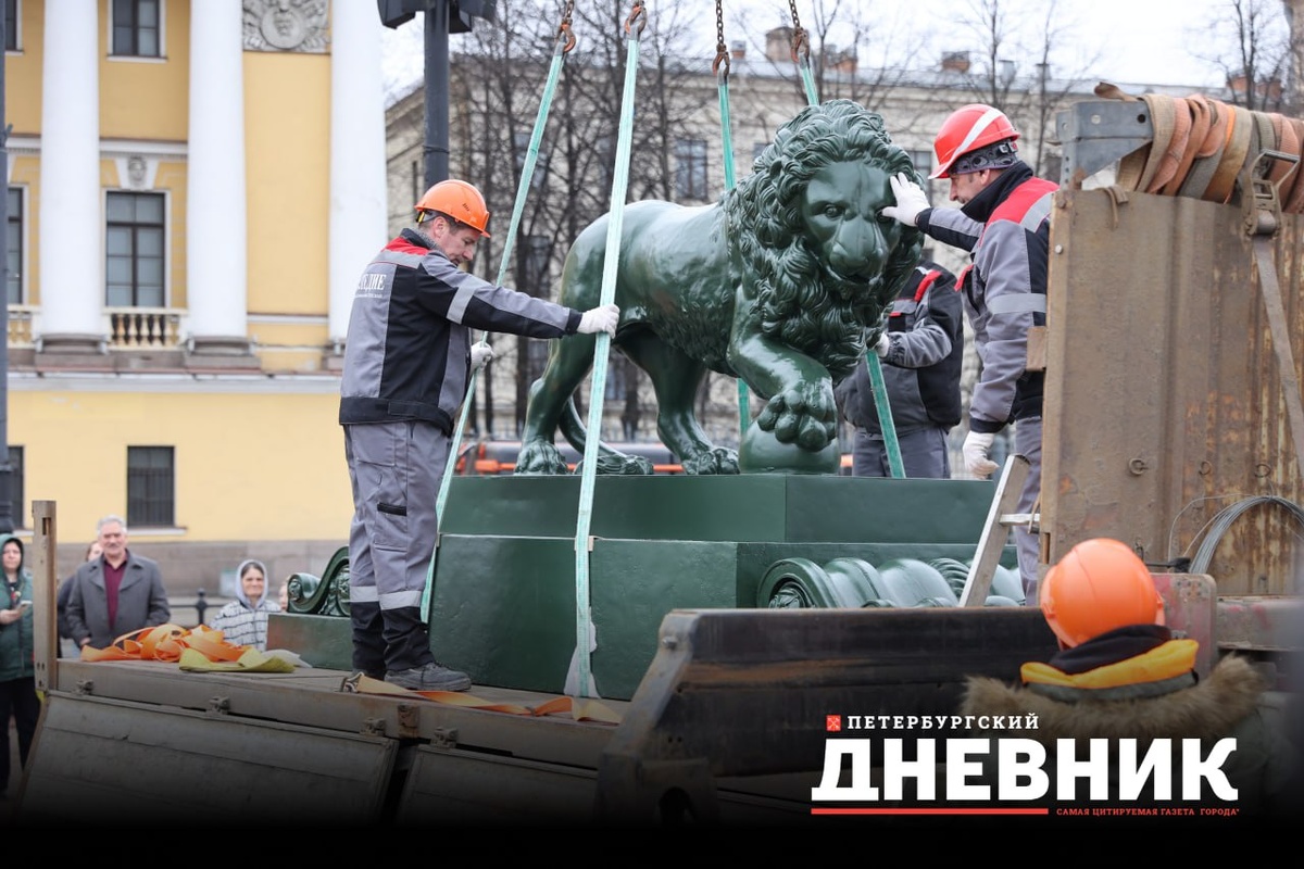 Скульптуры львов вернулись на Дворцовую пристань после проведения реставрации. В январе 2024 года их демонтировали с Адмиралтейской набережной для устранения повреждений, вызванных вандалами и любителями селфи. Специалисты расчистили скульптуры от загрязнений, устранили вмятины и покрасили их заново.