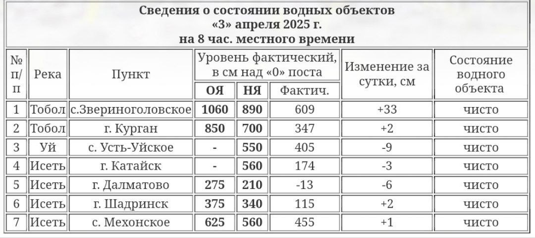 Актуальная информация об уровне воды в реке Тобол (3 апреля):