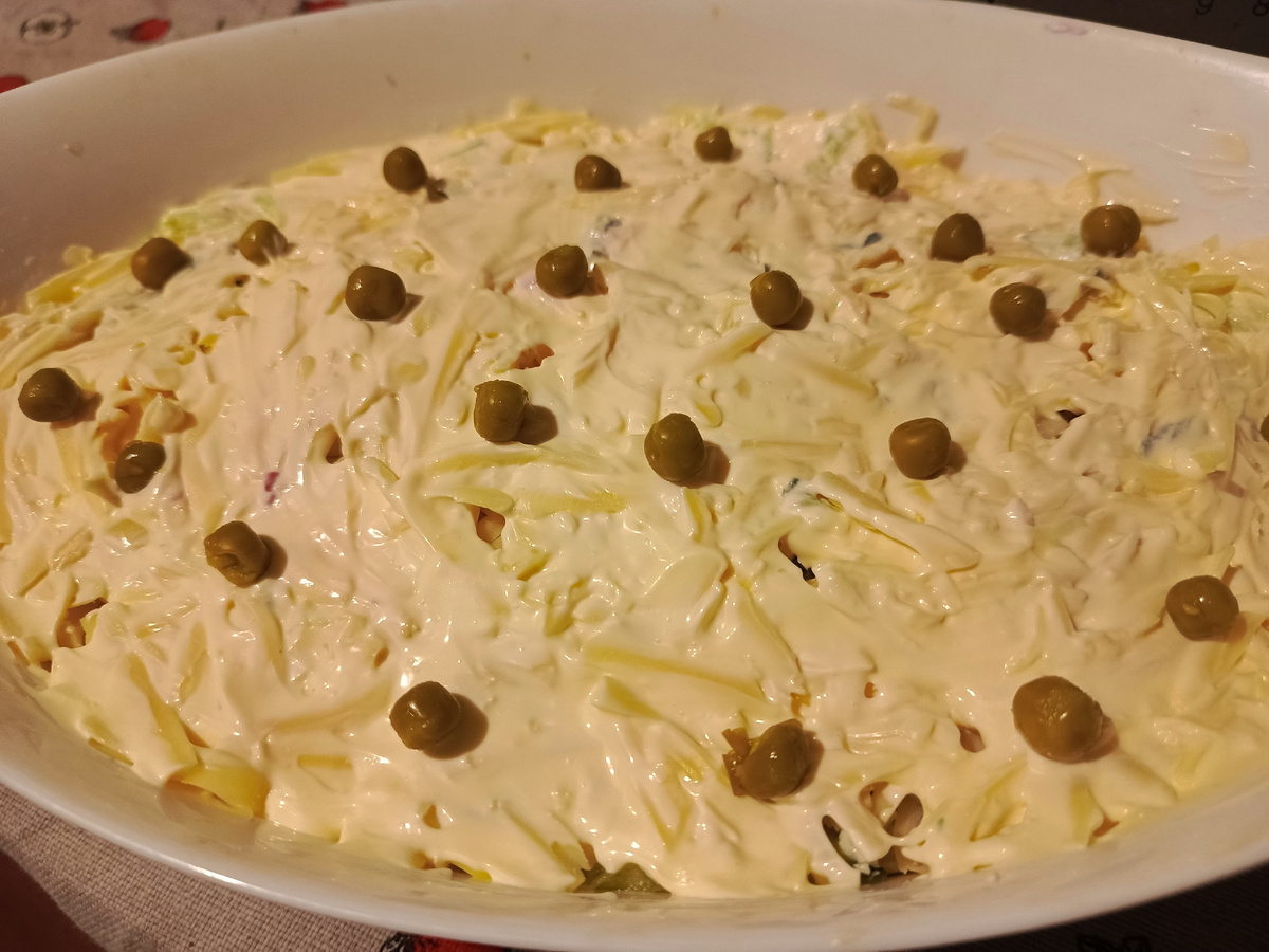 Салат многослойный. В салатник выкладываем консервированный горошек, сверху - сеточка из майонеза. Вареную свеклу трем на крупную терку, добавляем в нее чеснок и майонез. Перемешиваем. Выкладываем свеклу на горошек. Далее слой тертых огурцов и яиц. Затем - сеточка из майонеза. Сыр трем в крупную терку, смазываем его майонезом и выкладываем верхним слоем на салат. Украшаем салат горошком.