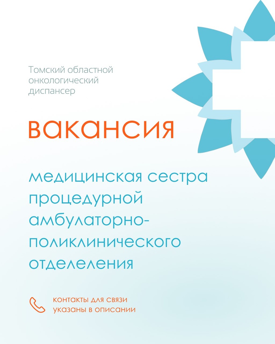 В Томский онкологический диспансер требуется медицинская сестра процедурной в амбулаторно-поликлиническое отделение. Приглашаем стать частью передовой медицины.