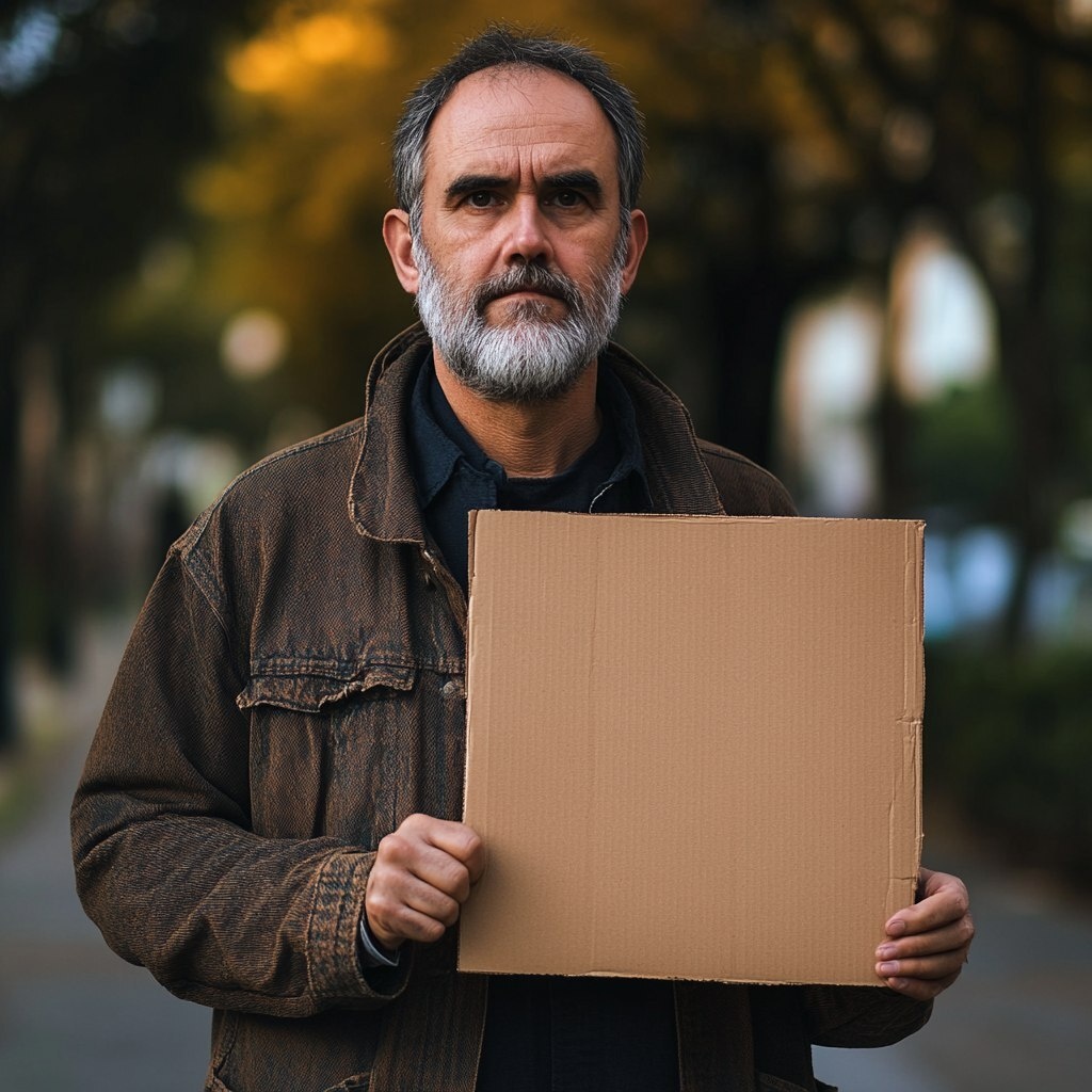 Создано на основе запроса: A 40 year old American man from Texas, holding a blank cardboard picket sign in one hand