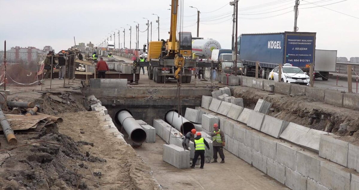 Напомним, что уже с утра на мосту работает дополнительная техника. Начали снимать старый слой асфальтового покрытия. Планируется сделать зачистку до бетонных плит. Трамвайные рельсы демонтируют, а покрытие восстановят. Многослойную укладку дорожного полотна с балластным корытом сделают таким образом, чтобы в дальнейшем, если такая потребность возникнет, рельсы можно будет восстановить с минимальными усилиями. Один из участков соединения между проезжей частью и тротуарными опорами сегодня залили бетоном. Как сообщил Сергей Шелест, работы по восстановлению первой половине моста завершатся в июле.