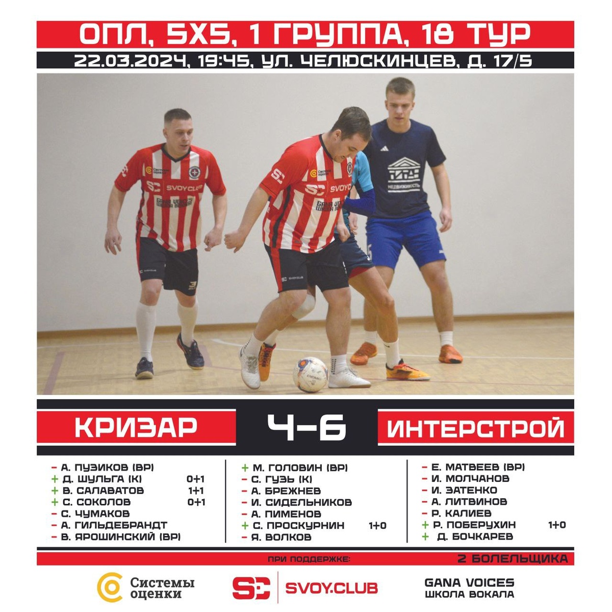 🏆 Оренбургская "Премьер-Лига", 5Х5, 1 группа, 18 тур 🆚 #КризарИнтерстрой 4 - 6 📅 22.03.2025 🕑 19:45 🏟 зал на ул. Челюскинцев 17/5 Обескровленные отъездом белорусов, терпим поражение... В этой игре элементарно не хватило сил. Хотя начиналось все для нас более, чем хорошо... Отдадим должное сопернику - выгрызли победу, с чем мы их и поздравляем... Что касается нас - перестройка в самом разгаре ! И, как правило, она не проходит гладко и без спадов ! Постараемся сделать так, чтобы этот спад был минимальным ! Ведите здоровый образ жизни! Играйте в футбол⚽! Болейте за КРИЗАР ❤🖤! При поддержке: SVOY.CLUB GANA VOICES - школа вокала Системы оценки Оренбургский драматический театр им. М. Горького Оренбургская областная библиотека им. Крупской Уютный гипс #fckrizar #мывоинывсейземли #дапребудетснамисила #WeAreKrizar #SvoyClub