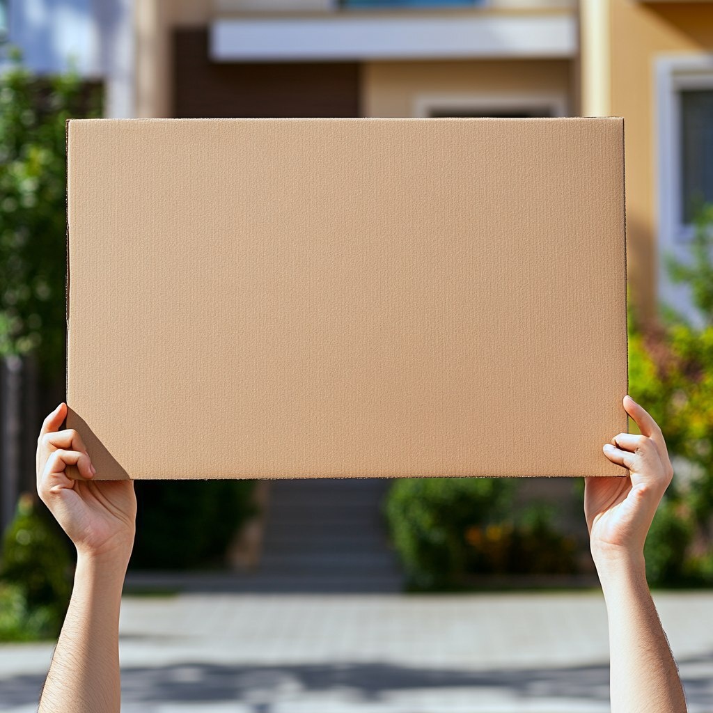 Создано на основе запроса: A pair of hands holding up a blank cardboard rectangular sign to the camera in front of a middle class American