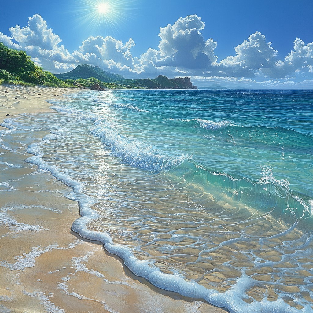 Создано на основе запроса: Create a realistic tropical beach scene with rich, vibrant colors. The image should feature clear turquoise waters, soft golden sand, and gently rolling waves. Include a bright sun shining in a clear, blue sky, with fluffy white clouds scattered above. Add realistic details like seashells on the beach and colorful beach towels or umbrellas to enhance the lively atmosphere of the scene. --- Автоперевод: Создайте реалистичную тропическую пляжную сцену с богатыми, яркими цветами. Необычно выглядит? 🤔 https://dzen.ru/id/65c0c65c86e4f837c27b24d7 #ИИ #AI #нейросеть #midjourney #art