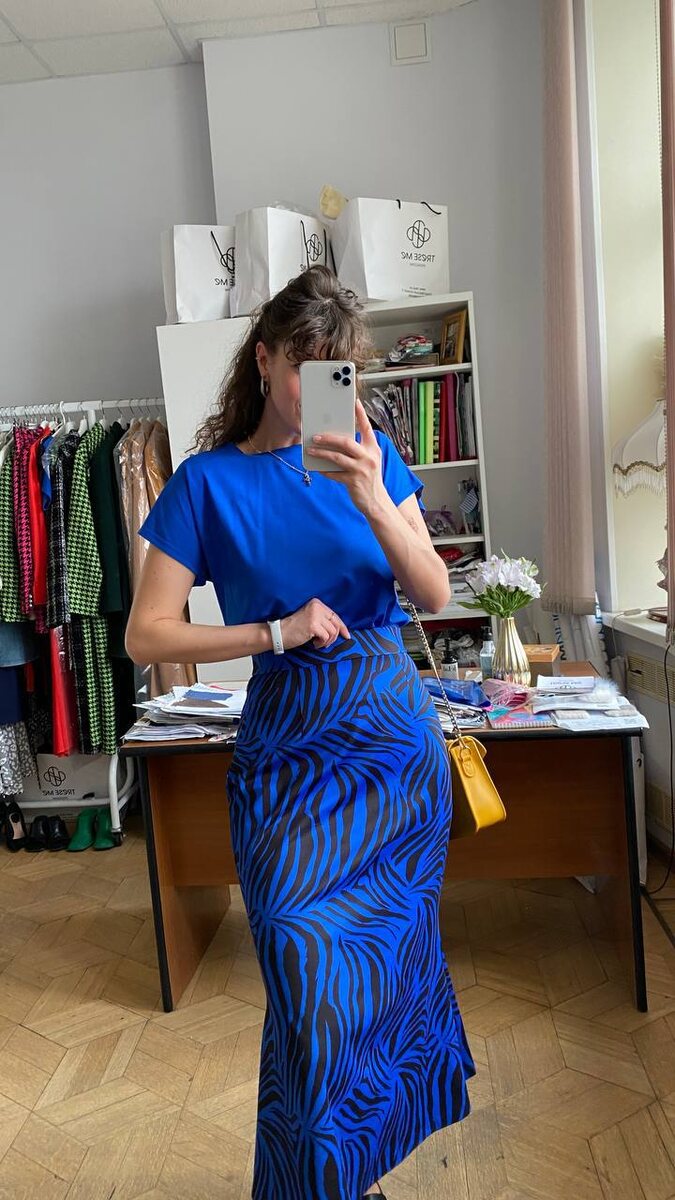 Вы замечали, что Стелла в каждой нашей коллекции удивительно четко и профессионально подбирает все оттенки тканей и фактуры, что позволяет составлять образы в едином стиле, или составить невероятные «колор-блоки»? • Синий топ из мягкой вискозы 💙 • Юбка Norah (не нуждается в описании)