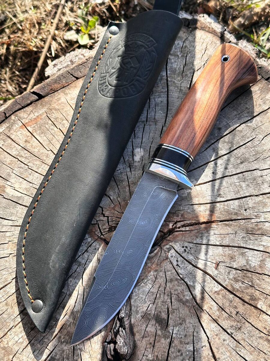 Классический разделочный нож Варан будет идеальным помощником и в быту и в лесу на охоте. Крученая дамасская сталь в 950 слоев, кроме красоты рисунка, имеет агрессивный рез, оптимальную твёрдость (HRC 62), что позволяет ножу и долго сохранять заточку и в тоже время, без особых проблем наточить нож в полевых условиях. Рукоять изготовлена из палисандра и черного граба. Цена по 30 апреля 8720 руб. Обычная цена 10260 руб. Можем изготовить формованные ножны из кожи растительного дубления (+ 8000 руб.) Для заказа писать на @Nazarklinokbot или по тел +79101343831, WhatsApp