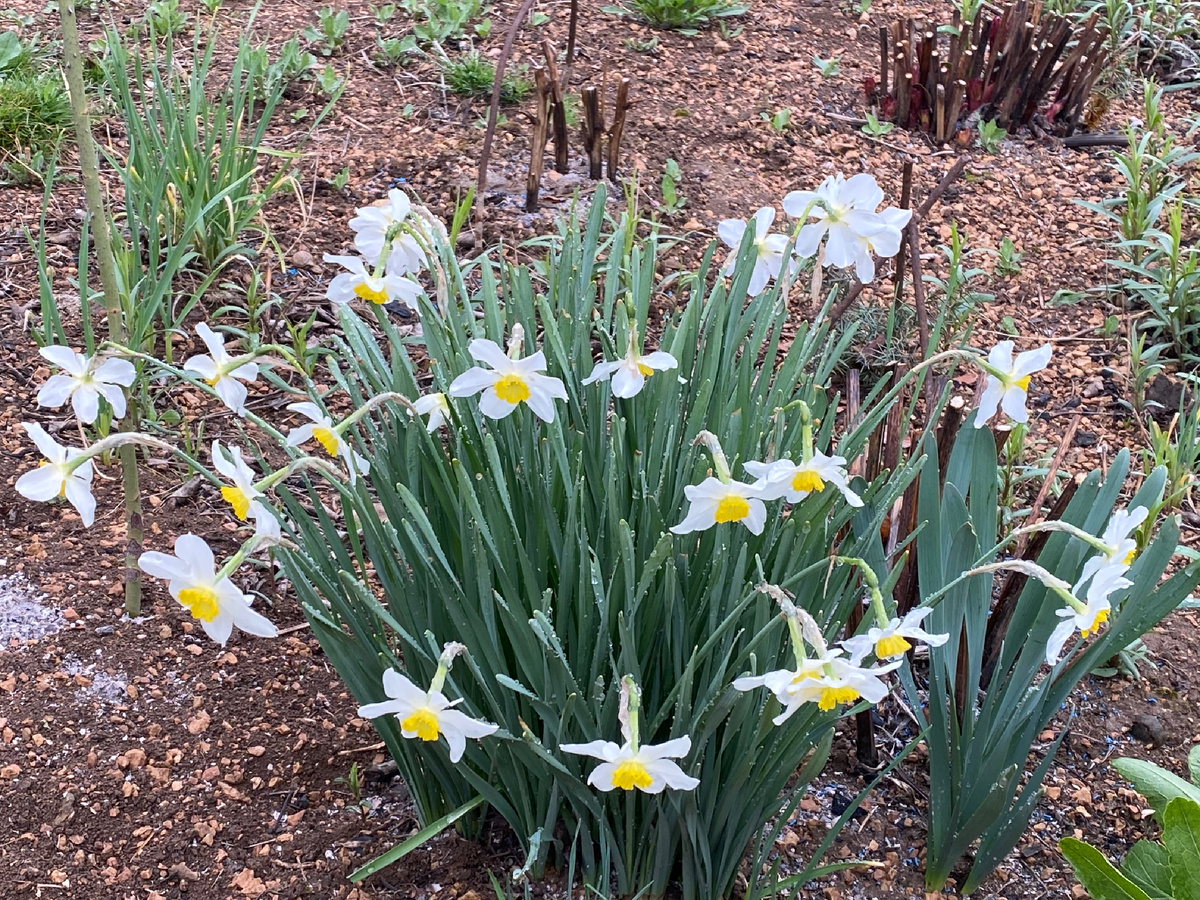 19.04.25 В начале апреля на первом месте нарциссы, форзиция, магония падуболистная, прострел, обриета, морозники. Ранний мартовский нарцисс перецвел, а махровые, из-за их тяжелых шапок, ветер поломал, продолжили цветение простые нарциссы. Если быть скурпулезным, не такие простые, а очень даже ароматные. Это малокапризные, почти безуходные нарциссы с приятным ароматом. Хотя разные сорта нарциссов заметно отличаются ароматами. Среди тех нарциссов, которые у нас растут есть и погромче. Вот этот, например. Мне больше понравилась букетная посадка. Были когда-то бордюры из нарциссов, захотелось убрать. Много их стало во время цветения. Других растений за ними не видно. А букеты понравились. После однодневного апрельского снега и ежедневного холодного ветра цветение нарциссов резко закончилось. И простых тоже. К середине апреля цветут все те же, вышеперечисленные для первой декады форзиция, магония падуболистная, прострел, обриета, морозники. Минус нарциссы, плюс ранние тюльпаны. Плюс