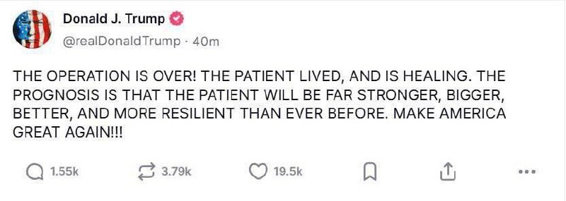Трамп сравнил США с выздоравливающим пациентом, говоря о введении импортных пошлин: «Операция закончена! Пациент выжил и выздоравливает. По прогнозам, пациент будет намного сильнее, больше, лучше и выносливее, чем когда-либо прежде. Сделаем Америку снова великой!!!» 🟩 Подписаться | Прислать новость | Читать аналитику