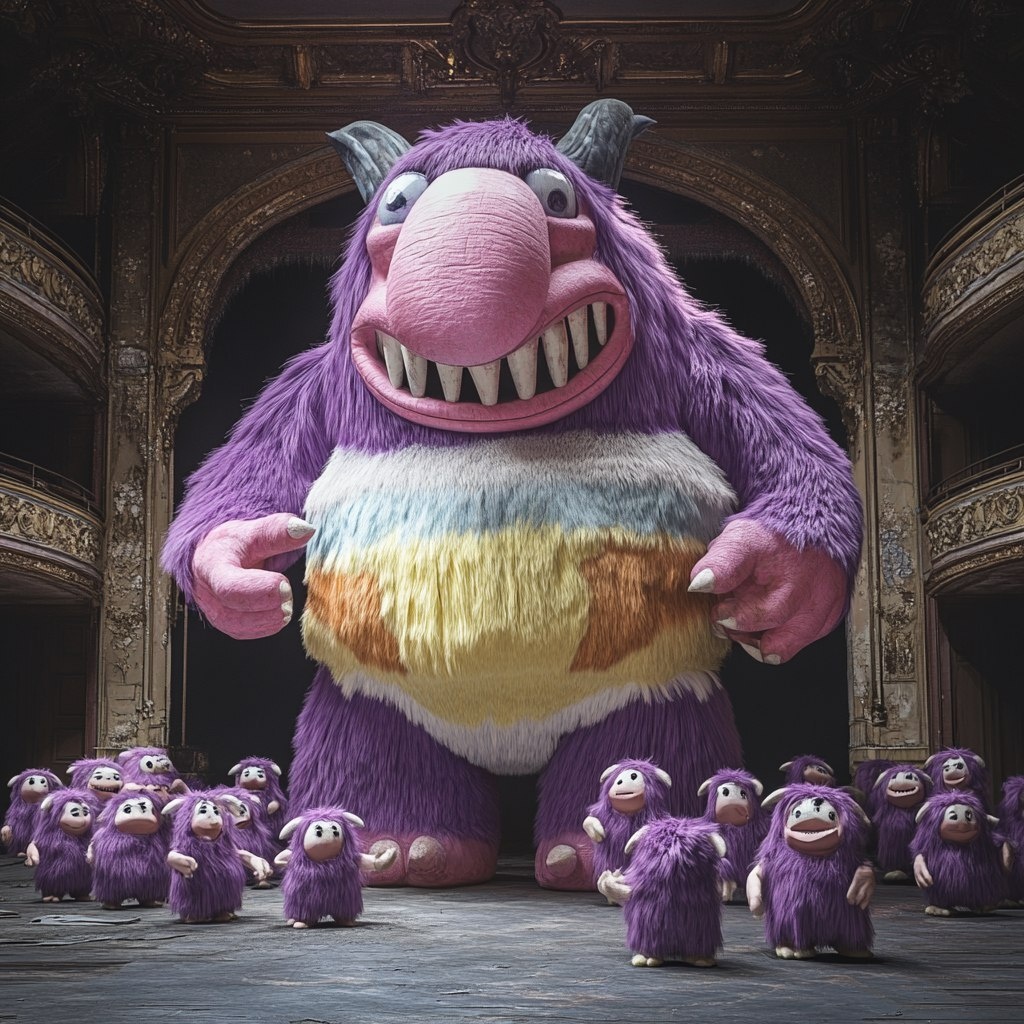 Создано на основе запроса: a photograph of a giant monster with a purple trunk surrounded by twenty similar little monsters, dancing inside
