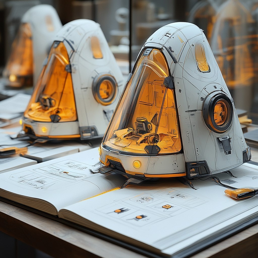Создано на основе запроса: A sketch shows a sketchbook with several triangular robot vacuum cleaner shapes, but it is not a vacuum cleaner, but a warning light in the shape of a vacuum cleaner. The vacuum cleaner is equipped with a fixture, with a light white and dark gray style, industrial and product design, bright colors, light yellow and dark silver precise technology, urban inspiration, futuristic mechanical accuracy - q2 - s25 --- Автоперевод: Эскиз показывает альбом с несколькими треугольными вакуумными формами робота, но это не пылесос, а предупреждающий свет в форме пылесоса. Хорошо выглядит? 🤔 https://dzen.ru/id/65c0c65c86e4f837c27b24d7 #ИИ #AI #нейросеть #midjourney #art