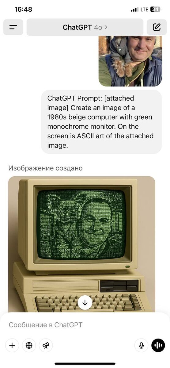 ChatGPT Prompt: [attached image] Create an image of a 1980s beige computer with green monochrome monitor. On the screen is ASCII art of the attached image.