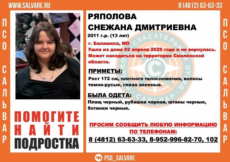 Снежана Дмитриевна Ряплова из Балашихи ушла из дома 2 апреля и не вернулась. 13-летняя подросток может находиться на территории Смоленской области.