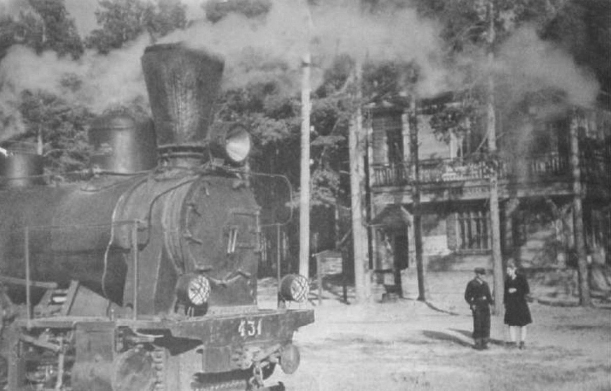 Станция Техническая в Каринторфе во времена, когда по узкоколейной железной дороге курсировали паровозы. Первый паровоз прошёл по ней летом 1942 года 🚂