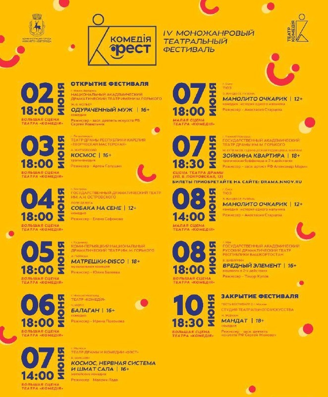 Со 2 по 10 июня четвёртый фестиваль «Комедiя-ФЕСТ» в Нижнем Новгороде. Свои спектакли представят лучшие театры со всей России. Их география — от Карелии до Сибири. Откроют фестиваль классической комедией Мольера участники из Минска – Национальный академический театр имени Горького. А на закрытии зрители увидят комедию «Мандат» Николая Эрдмана в постановке известного российского режиссёра Сергея Женовача, которую покажет гость фестиваля - московский театр «Студия театрального искусства». #яместный