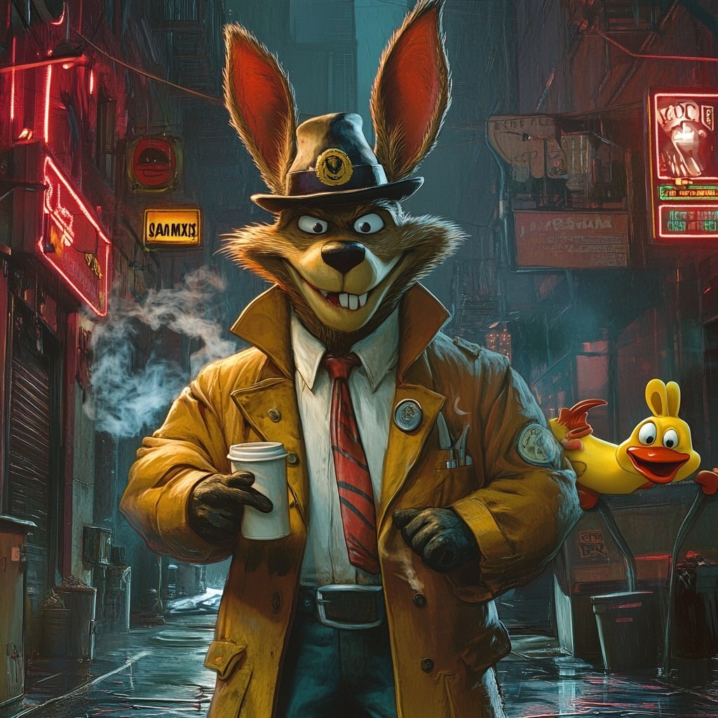 Создано на основе запроса: Create a surreal character fusion of Sam and Max from the Sam & Max series, merged into one chaotic, crime-solving form called ‘Samax’. This hybrid has Sam’s tall, lanky canine body dressed in his iconic oversized detective trench coat and fedora, but with Max’s wide, toothy grin and manic rabbit eyes peeking out from one half of the face. One of the arms is Max’s --- Автоперевод: Создайте сюрреалистическое слияние символов Сэма и Макса из серии Sam & Max, объединенное в одну хаотичную, криминальную форму под названием «Samax». Красиво выглядит? 🤔 https://dzen.ru/id/65c0c65c86e4f837c27b24d7 #ИИ #AI #нейросеть #midjourney #art