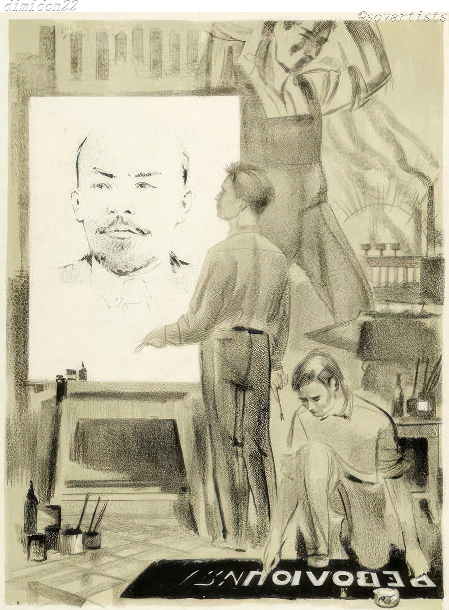 Шевяков Григорий Романович (__.__.1905, Оренбург - 17.09.1982, Ташкент). «Молодые художники». 1926 год. Бумага, литография; 655 х 570 мм.; (Музейное объединение «Музей Москвы»). Источник: https://vk.com/wall-199943427_47565