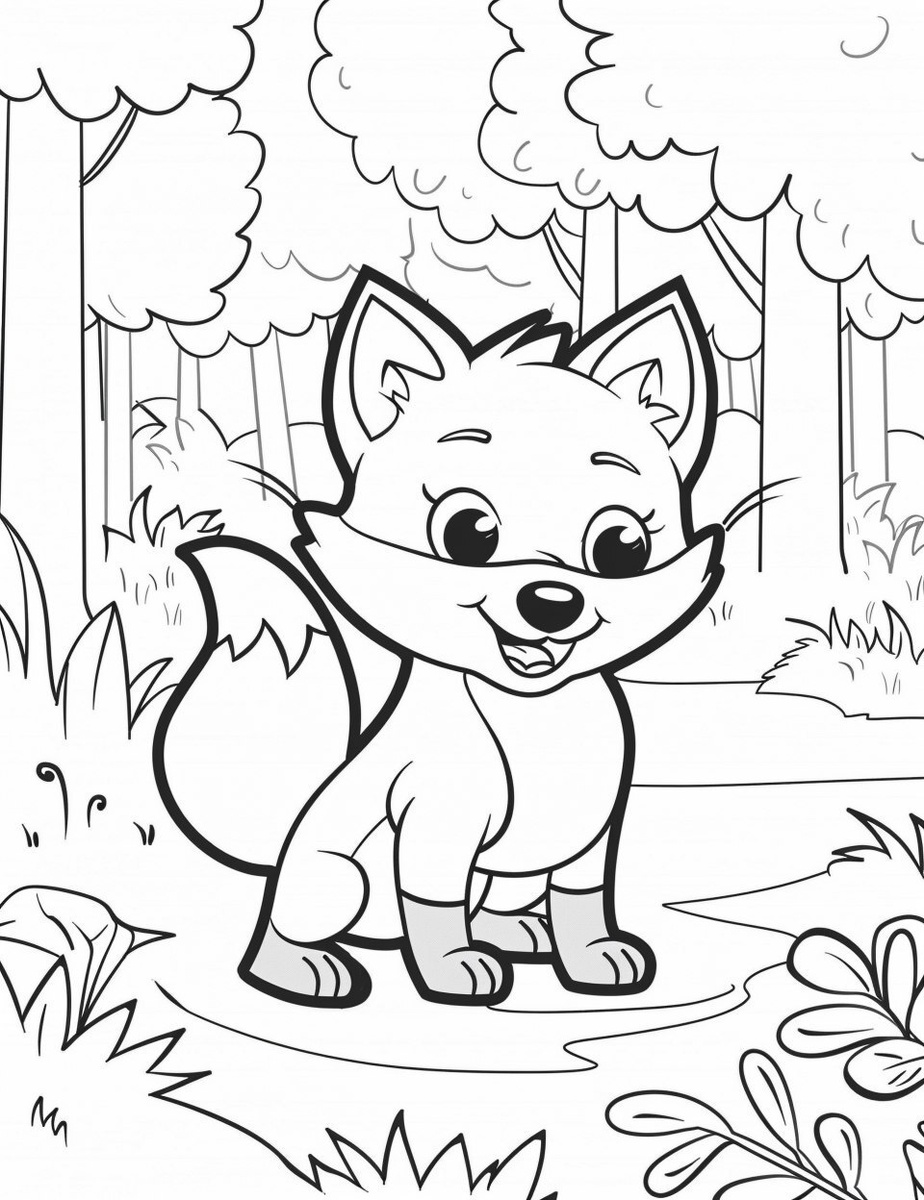 Создано на основе запроса: A simple black-and-white coloring page for toddlers (3 years old) featuring a cute cartoon fox