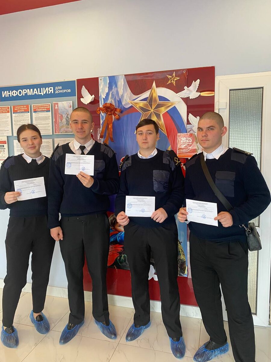 Сегодня сдавали кровь курсанты ИМТМЭиП: Никита Припутнев, Максим Коцырев, Владислав Попов, Константин Марченко, Кристина Панарина