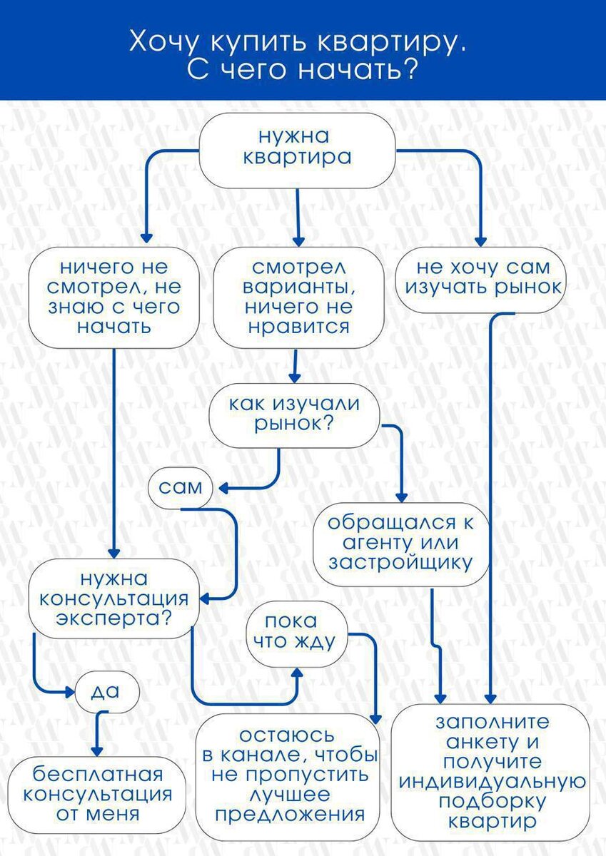 Как купить квартиру мечты? Путь к покупке квартиры бывает запутанным, длинным и сложным. Иногда кажется, что решения нет, а возможности исчерпаны. Но это всего лишь иллюзия. На самом деле выходов намного больше, чем кажется! На каком бы этапе поиска вы ни были, я готов помочь и подобрать для вас лучший вариант. Даже если изначально ничего не подходило, или вы уже имели опыт подбора в другом агентстве или у застройщика – вместе мы найдём идеальное решение. Пусть моя краткая схема напоминает об этом ☝️ Если у вас есть желание купить квартиру в Москве или Санкт-Петербурге, заполните анкету на консультацию. Я свяжусь с вами и подробно расскажу про все варианты. 👉 КОНСУЛЬТАЦИЯ