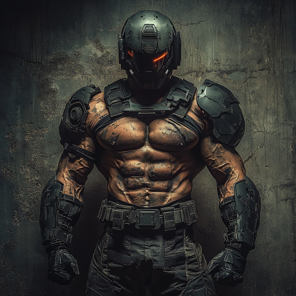 Создано на основе запроса: allegory of masculinity and modernism in a battle / ripped man in a futuristic mechanical cyberpunk military