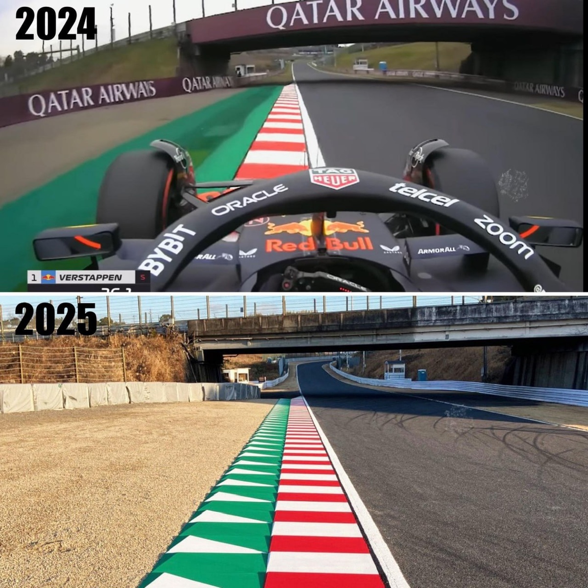 В Японии серьезно изменили пределы трассы: На внешке 2, 8 и 9 поворотов насыпали гравий, а поребрики перестали быть плоскими, получив форму пирамидок, которые усложнят жизнь любителей выехать пошире. Также с 1 по 8 повороты переложили асфальт.