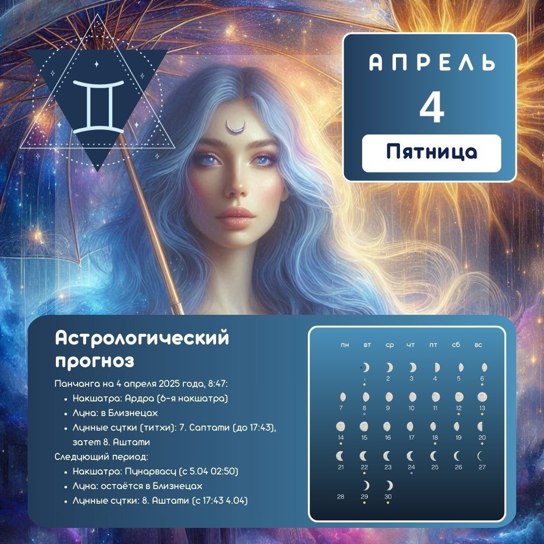 Астрологический прогноз на 4 апреля 2024 года (Джйотиш) День недели: Пятница (управитель — Венера) Луна в Близнецах, 7-е лунные сутки (Титхи) до 17:43 → 8-е лунные сутки Месяц Чайтра +8-e лунные сутки→ комбинация Шунья Титхи (осторожность в новых начинаниях). Ключевые астрологические факторы дня: 1. Шунья Титхи — период "пустоты", неблагоприятный для стартов, крупных решений и финансовых рисков. 2. Ардра накшатра (с 3:21) — связана с трансформацией через эмоции, слезами, очищением. 3. Сиддха йога (до 17:43) — смягчает негатив, даёт шанс завершить дела успешно. Рекомендации по временным периодам: Утро (6:22): Ваниджа карана - Энергия: Благоприятна для торговли, обсуждения прибыльных проектов, коммуникации. - Совет: Проведите переговоры, составьте планы, но не принимайте окончательных решений. - Влияние Луны в Близнецах: Уделите внимание обучению, обмену идеями. С 17:43: Вишти карана - Энергия: Вишти ("препятствие") усиливает конфликты и неопределённость. - С