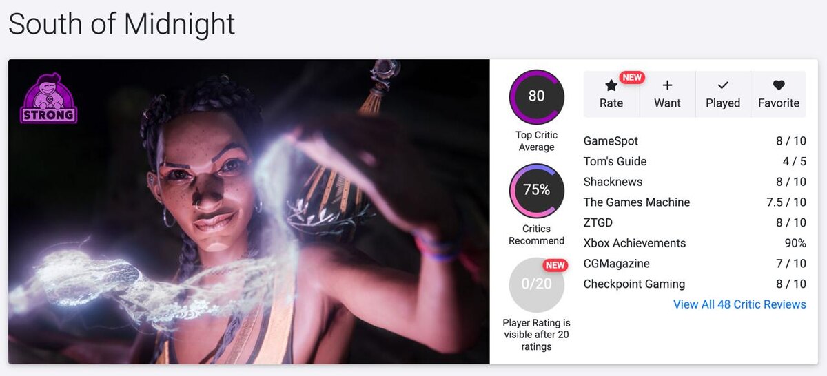 South of Midnight — 8/10. 48 обзорщиков выдали свой вердикт игре. В основном её хвалят: атмосферная, фантастическая история и занимательный антураж, очень красивая и самобытная. Даже если вам не интересен современный фольклор юга США, сюжет и мир всё равно будут захватывающими. Некоторые надеются на то, что это начало серии. Из минусов отмечают повторяющиеся стычки с врагами и слабый платформинг. Отмечу, что сюжет нахваливают даже те, кто поставил низкую оценку и обругал всё остальное 🤔 Релиз 8 апреля. Будет в Game Pass.