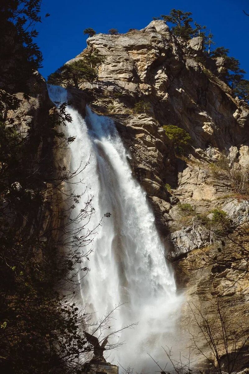 - Пейзажи на пути к водопаду волшебны — в этих местах густые хвойные леса, зелёные поляны и редкие виды растений. Вдоль тропы можно встретить тюльпаны, горную лаванды, а на высоте — крымский кустарник, можжевельник, и даже такие редкие растения, как эфедра. Вокруг растут деревья, которым сотни лет, создавая настоящий зелёный ковер. А если повезет, то вы сможете встретить редких животных — крымских ястребов, которые парят в небе, или ласточек, ловящих воздух в этих горных районах.