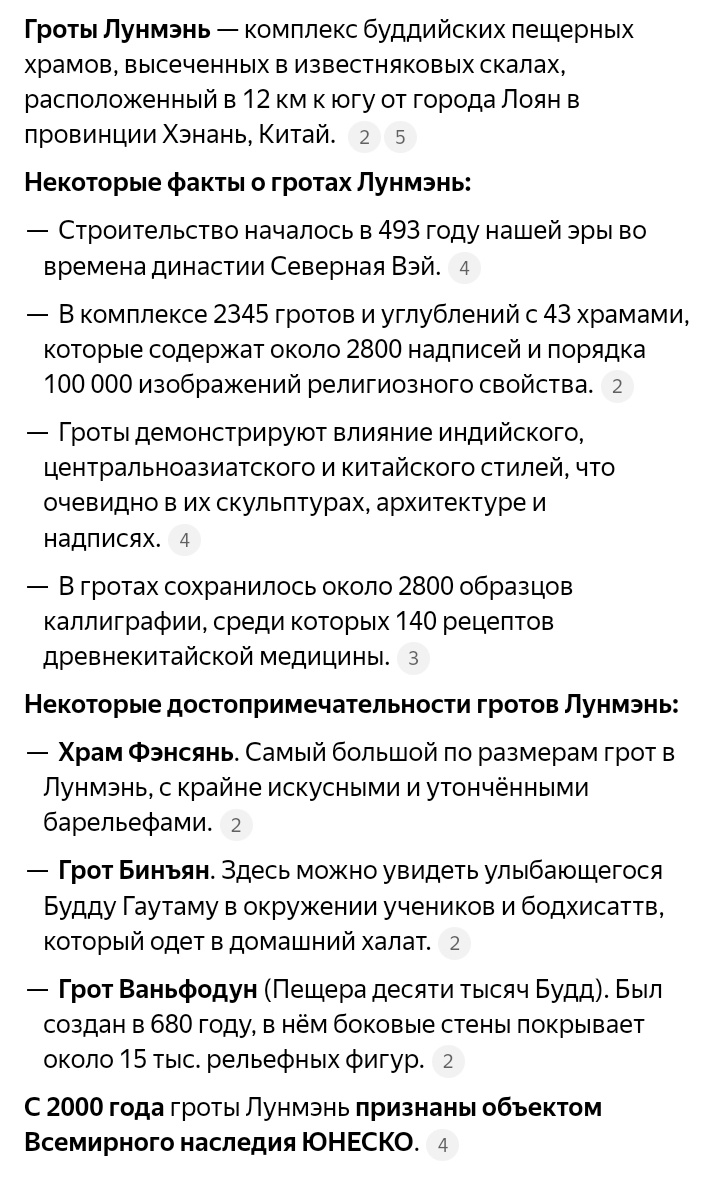 Строительство началось в 493 году, И продолжалось в течение 6 последующих династий. В гротах сохранилось около 2800 образцов каллиграфии, среди которых 140 рецептов древнекитайской медицины. Многие из китайских статуй лишены голов, а у некоторых лица сбиты молотком, по одной из версии то связанно с временем династии Суй, Которая не очень любила буддистов. (Я думаю что это связано с тем что "статуи перестали работать" и их таким образом наказывали по сути пришли коммунисты и взорвали православные храмы, как думаете сколько эта новая власть потратила денег на взрывы храмов и сколько золота ушло за границу?) Гроты тянуться на протяжении 1 км. вдоль реки И́и по обе её стороны. На восточном берегу находится большое количество небольших пещер, служивших местом жительства для многочисленных групп монахов.