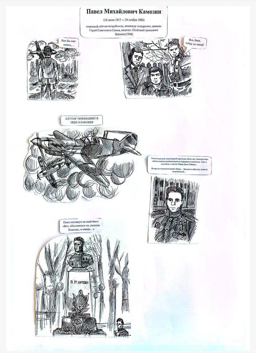 #Трек6 Создание графической новеллы о героях войны Команда «Орлята России» МБОУ СОШ 11 имени П.М Камозина г. Брянска В рамках проекта «80 Добрых дел к Победе» команда «Орлята России» представляет графическую новеллу об участнике Великой Отечественной войны, дважды Герое Советского Союза Павле Михаловиче Камозине. Наша графическая новелла – это не просто дань памяти герою, это попытка оживить историю, сделать ее ближе и понятнее для современного поколения. #80ДобрыхДелКПобеде #ФорумКлассныхРуководителей #Сферум80ДобрыхДел